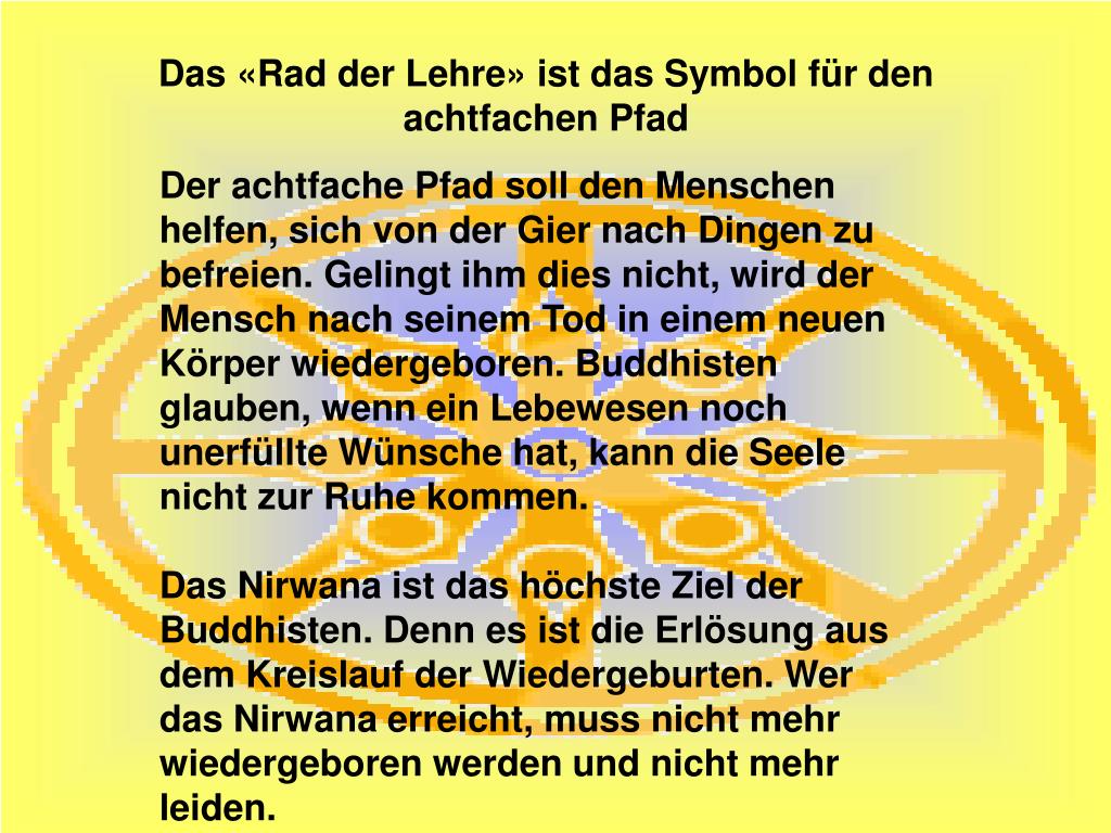 15/05/2015 · der edle achtfache pfad. Der edle achtfache pfad ist das zentrale element der lehre des buddha und wird dargelegt u.a. Das, was der buddha gelehrt hat, nennt man den dharma, das ist ein altindischer ausdruck für "lehre". Er wird von allen buddhistischen schulen als wesentlicher gemeinsamer lehrinhalt angesehen. Buddha entdeckte ein gesetz zur befreiung vom leiden, dieses naturgesetz, in pali dhamma genannt, war und wird immer da sein, nur zu manchen zeiten ist er durch verblendung verborgen und es braucht einen vollkommenen erwachten, der es wieder entdecken und offen legen kann. Die meditation ist eine der buddhistischen lebensregeln des achtfachen pfades.. Das, was der buddha gelehrt hat, nennt man den dharma, das ist ein altindischer ausdruck für "lehre".